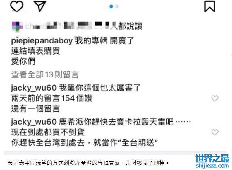 其实也不是调侃,只是父亲希望助他一臂之力,希望他的专辑大卖。吴睿轩留言:你这个太厉害了,两天前的留言154个赞,还有一个留言!鹿希派,你赶快去买卡拉轰天雷吧,你赶快去,就当全台亲送。