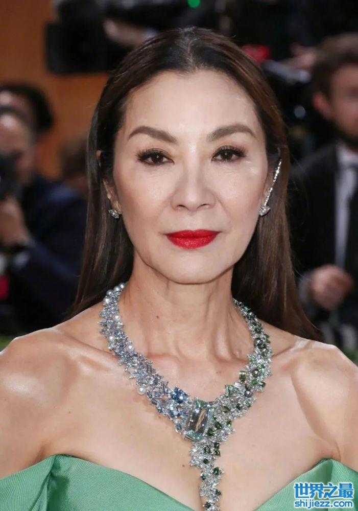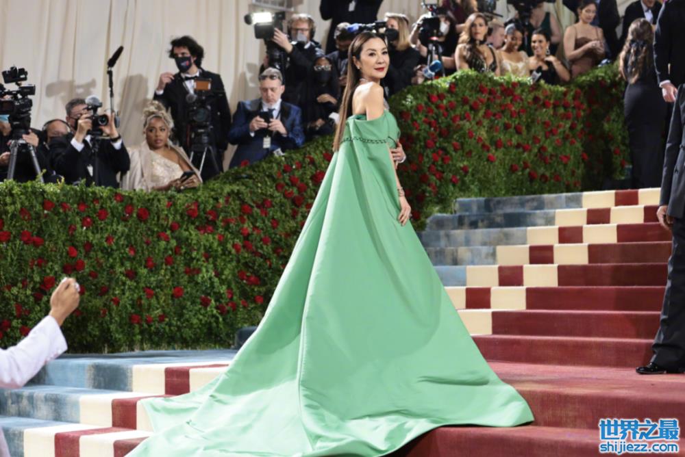 同样被摄影师拍成五五分的还有武打巨星杨紫琼,杨紫琼身穿一身绿色大披风礼服,本该清新淡雅,却因视觉差成“小矮人”。