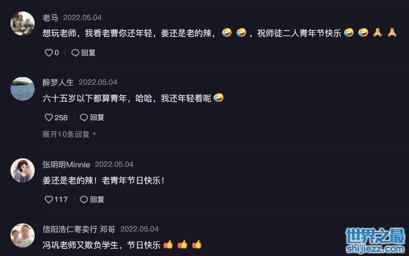 在最后,冯巩还不忘祝大家青年节节日快乐,并比出“耶”的手势。一旁的徒弟则是一脸不高兴地推开了冯巩的手,师徒二人显得格外搞笑。