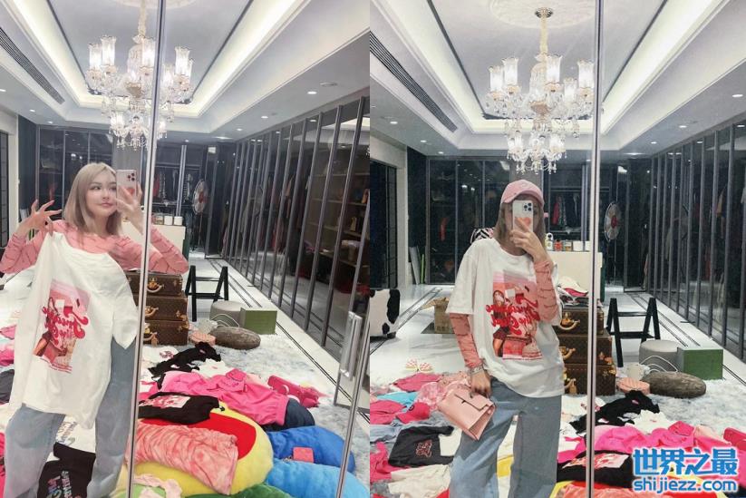 在照片中可以看到,周扬青的衣帽间面积很大,装修得也很精致,顶上的水晶吊灯倍显奢华。除此之外,周扬青身后还有一整面墙的名牌包包,全都堆在一起显得有些凌乱,数量也很惊人。