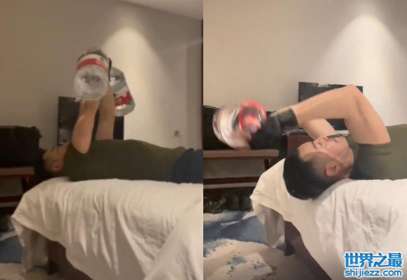 在地上练完之后,海一天有躺倒床上练起了手臂。他一手拿着一桶水往上托举,咬紧牙关的他,表情很认真。在房间内也不忘健身,不得不说,海一天真的很自律。