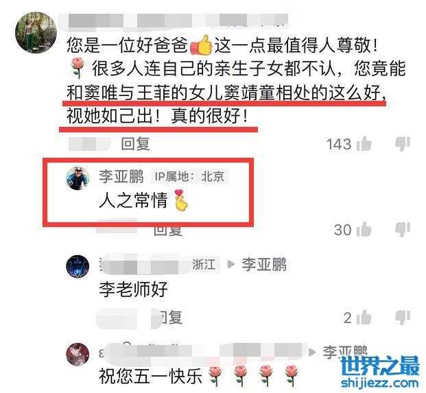 有一位网友评论说:“您是一位好爸爸,这一点值得人尊敬!很多人连自己亲生子女都不认,您竟能和窦唯与王菲的女儿窦靖童相处得这么好,视她如己出,真的很好”,李亚鹏也回复了这条评论:“人之常情”,