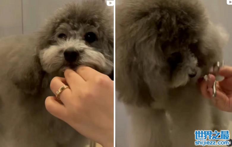 黎姿的动作非常熟练轻柔,狗狗在她的温柔修剪下,甚至都差点睡着了,而且黎姿的胆子也很大,在帮狗狗剪嘴边毛发时,她的手直接顺着剪刀放到了狗狗的嘴边,似乎完全不怕被狗狗咬到。