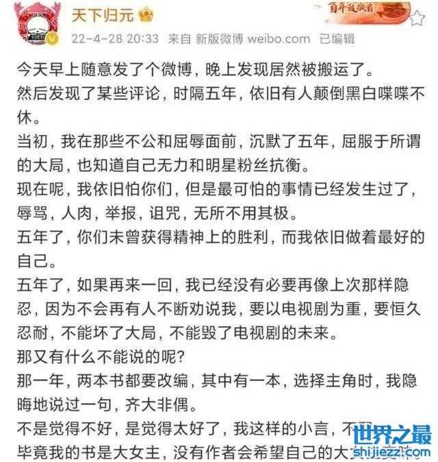天下归元发完这条微博之后,又发了个小作文回应了当年的改变争议,她称自己在整个作品中没有多少发言权,自己哭过很多次,眼睁睁看着它被蔑视,被挫骨扬灰,仿佛已经不是她的东西了。