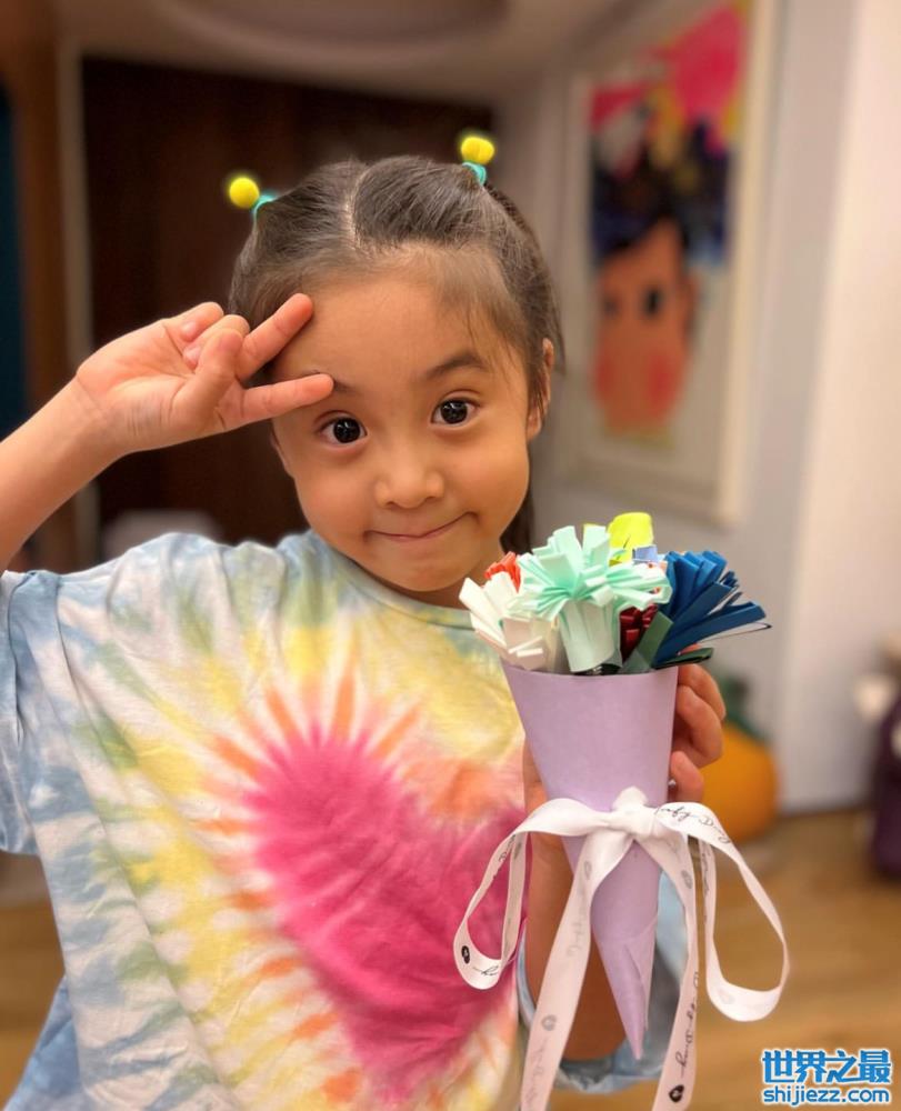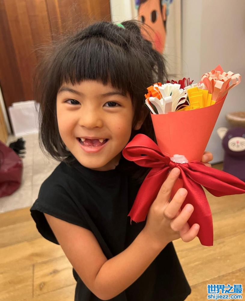 贾静雯其中一个女儿因为换牙所以门牙都掉光了,不过她还是十分大方地捧着为妈妈亲手做的手工花,对着镜头开心大笑,看起来非常可爱。