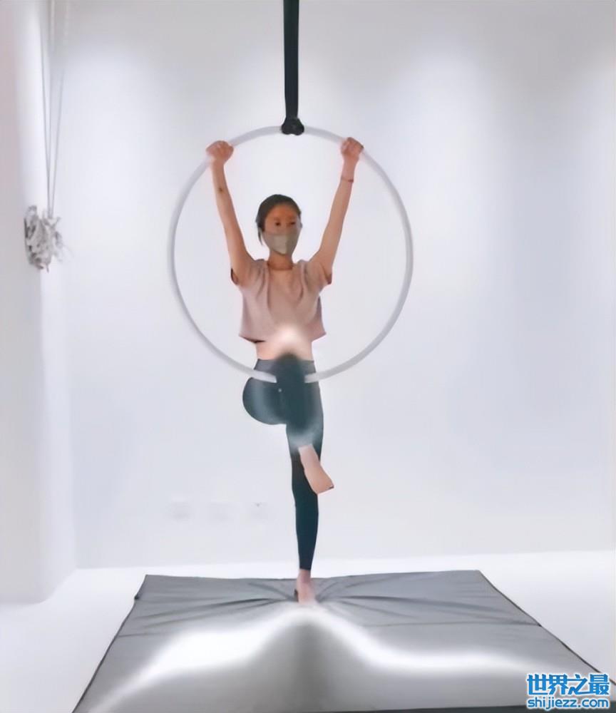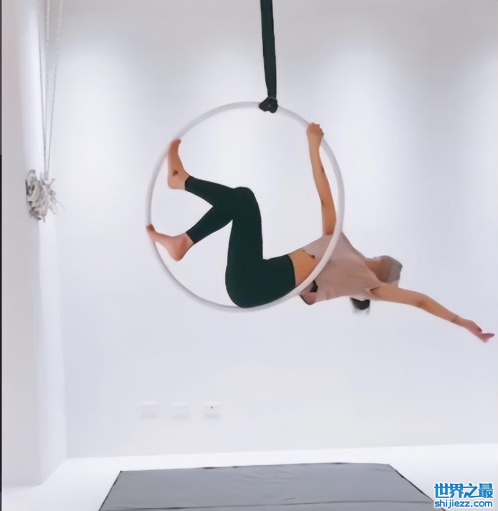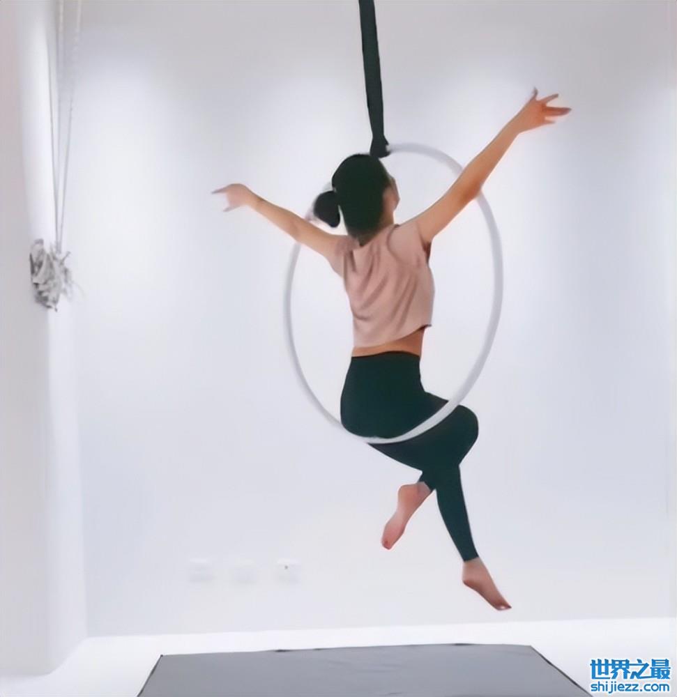 不得不说林心如在空中吊环上所做的动作非常专业,仔细看图片,她整个人的几乎呈现出平躺的姿势,而且两只脚都搭在吊环上,如果没有受过专业的练习,估计一般人真的做不到吧。