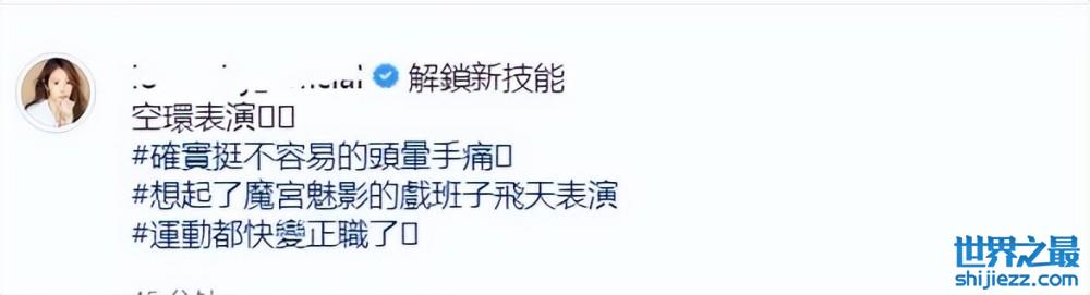 林心如发文:解锁新技能,空环表演。确实挺不容易的,头晕手痛的。想起了魔宫魅影的戏班子飞天表演,运动都快变成正职了。