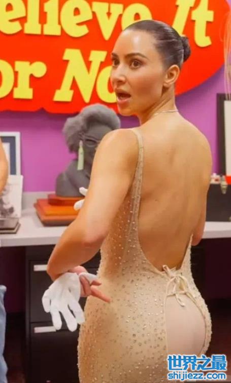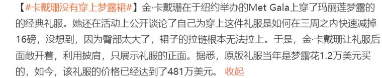 但玛丽莲梦露的身材有多完美,想必大家非常清楚,卡戴珊作为靠丰腴而出圈的艺人,在穿着如此紧身的连衣裙时,不得不提前减肥控制身材,但即便是在3周内快速减掉15磅的情况下,卡戴珊也没有能成功穿进这件衣服。