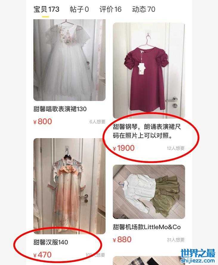 比如上面这一件甜馨的汉服140,甜馨曾和妈妈李小璐穿着一起拍过照片。直接出价470元,而且还有超过100多个人想要这一件汉服。还有甜馨的钢琴表演裙,标价也不便宜,1900元。但还是有12个人想要。