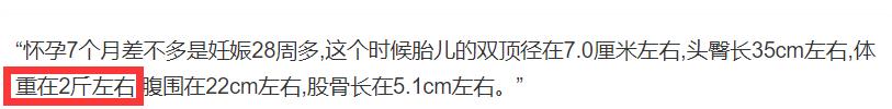 据悉,怀孕7个月也就是28周的时候,肚中胎儿的体重大概是在2斤左右,怀孕8个月胎儿的体重大概在4斤左右,按照这个标准数值,苗苗上月产检时肚中的胎儿已超7个月,但不足8个月。