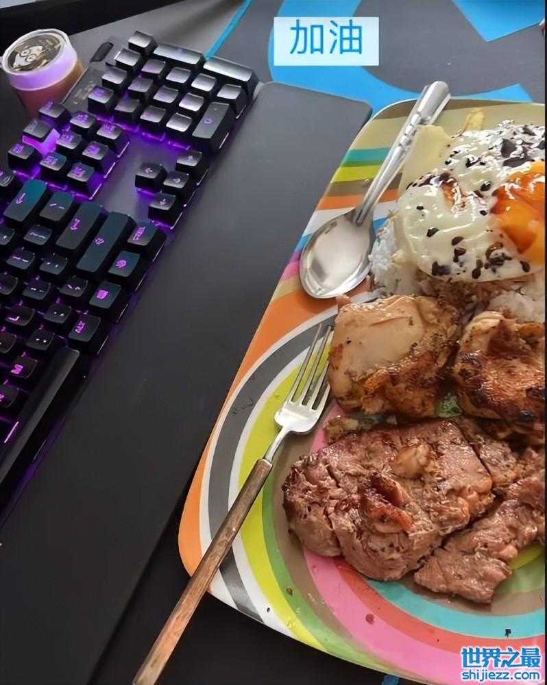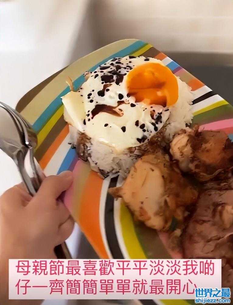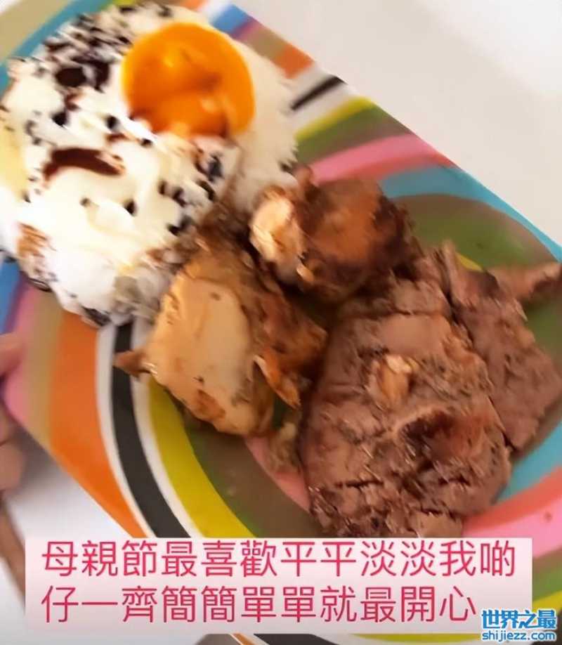 这是一份牛排饭,张柏芝还在旁边配上加油的字眼。母亲节的时候她应该是还要工作,在家中的电脑旁边拍摄这一碗饭。