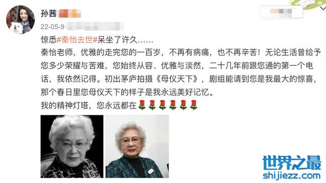 孙茜在社交平台发文,不敢相信这个消息,听闻之后呆坐了许久。称秦怡老师是她的精神灯塔,她永远都在。