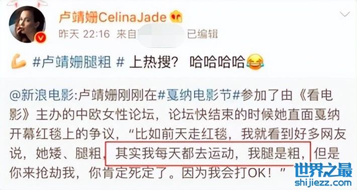 被网友评价腿粗,卢靖姗丝毫不会因此沮丧,反倒要当众给你怼回去:我腿是粗,但你抢劫我,你肯定死定了,因为我会打,ok?