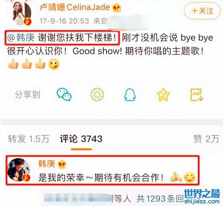 当时典礼结束,卢靖姗还在微博上感谢了韩庚。