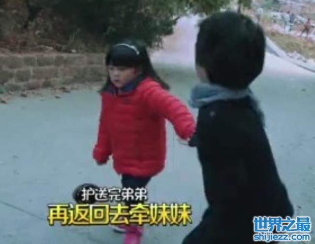 在一起走一段有些陡的上坡时,天天会牵着弟弟妹妹们一起往上爬。送完弟弟,天天便有返回去牵小妹妹王诗龄。看得出来天天是一个十足的小暖男。