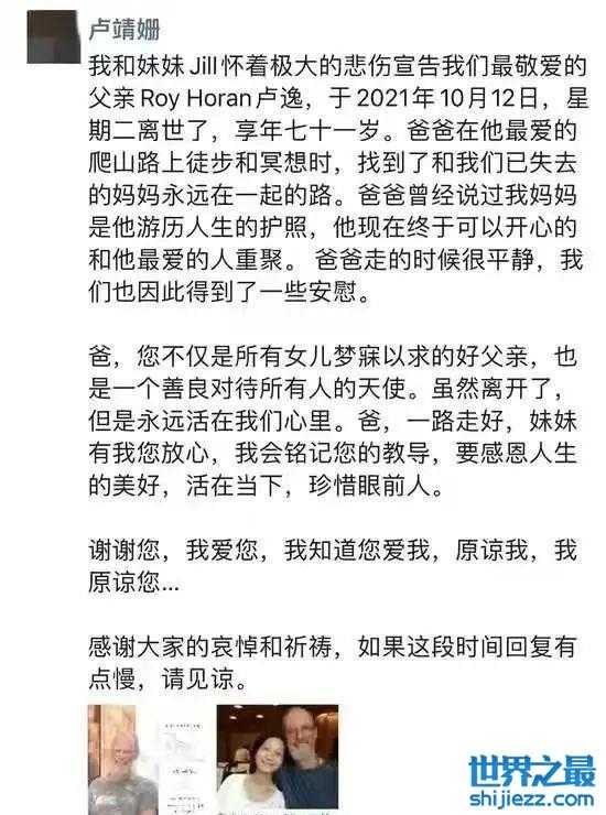 宝宝的到来对于卢靖姗而言或许是个不小的安慰,因为去年,她的父亲在爬山中途离世了,享年71岁。