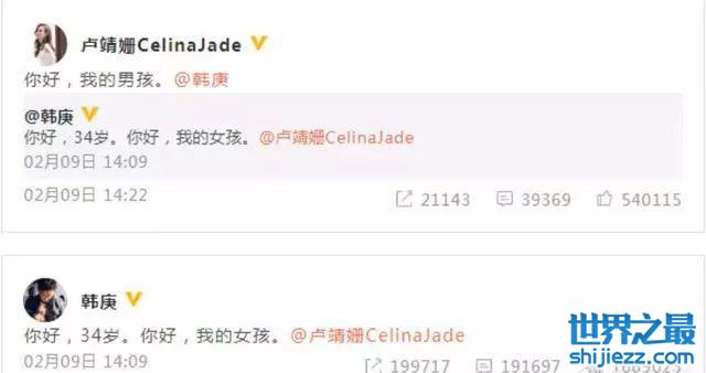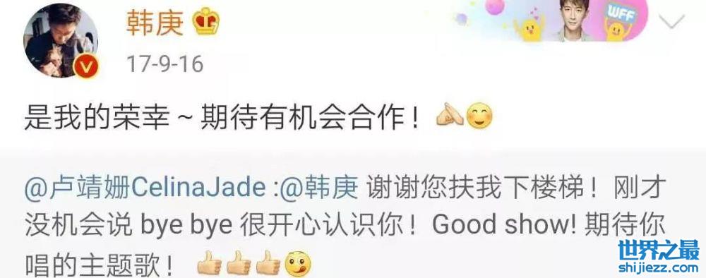 所以说女生心动的点有时候就是这样不经意的小细节,卢靖姗很明显对韩庚有了好感,一下台就忍不住发博艾特韩庚,说“很开心认识你”。