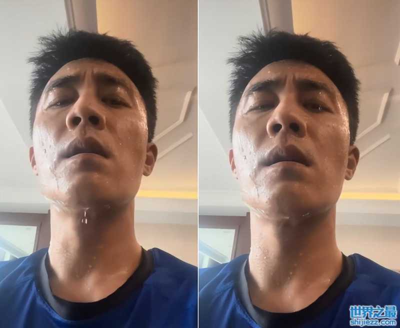 随后,杜淳又将镜头转向了另一个角度,他将自己的头微微抬起,汗水便随着脸抬起来后的角度顺着往下流。而且不仅脸上,杜淳脖子上的汗水也将衣领边上的一圈全部浸湿,看来确实如他自己所说,真的是个水做的男人。