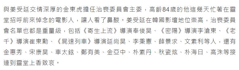 仪式现场,担任葬礼司仪的刘智泰更是口吻悲伤,声称自己一点感觉也没有,多么希望这是电影里的场景。另外,他还补充说:“ “在送姜受延前辈离开的时候,家人和电影界的前后辈们一起出席了,感谢大家的陪伴。”