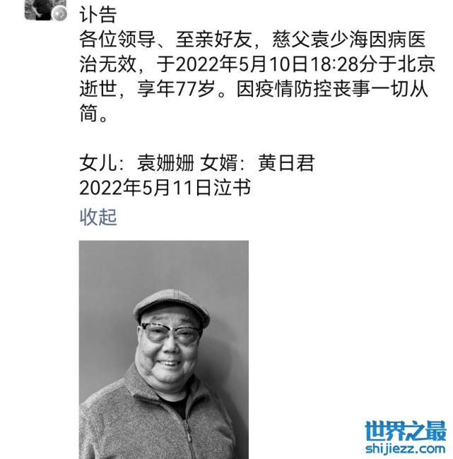 5月11日,艺术圈再传悲痛噩耗,著名京剧表演艺术家袁少海不幸病逝,终年77岁,据悉,袁少海离世之后,其女儿袁姗姗、女婿黄日君正式对外发布讣告,透露袁老先生是于2022年5月10日18点28分在北京逝世,至于袁老的葬礼后事,其家人也表示会一切从简。