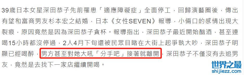 在详细的报道资料中得知,深田恭子有一次喝酒时间长达15小时未曾停歇,导致引发了男友的不满。