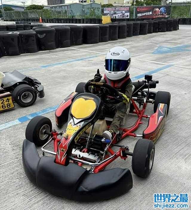 除此之外,实地实践也必不可少。林志颖还经常带孩子们去赛车,图片中7岁的Jenson穿着赛车服坐在赛车上,一只脚踩着油门,戴着大大的头盔,架势十足。赛场周围摆放着一排排轮胎,环境空旷。林志颖配文道自从Jenson在停课时接触到了卡丁车,便天天吵着要去赛车。