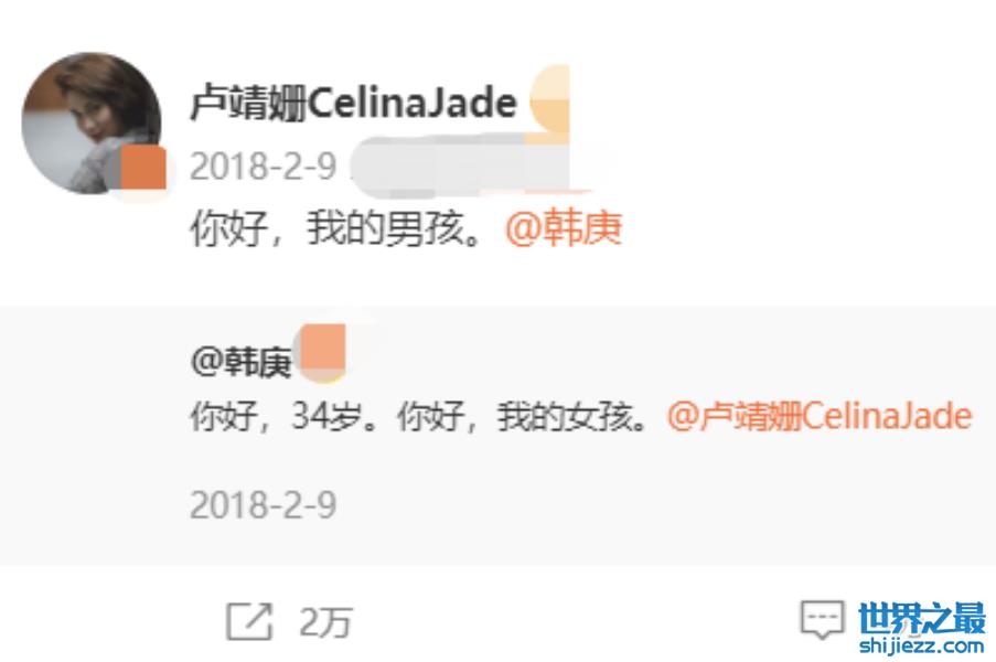 这两人在2018年官宣恋情,韩庚在自己34岁生日时发文称“你好34岁,你好我的女孩”,卢靖姗也回应“你好我的男孩”,甜煞众人。但也有许多人不看好这二人之间的感情,觉得韩庚配不上卢靖姗。