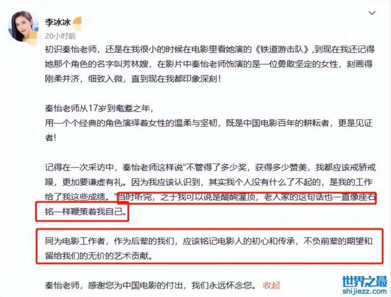 著名女星李冰冰在听闻秦怡老师离去的噩耗之后,在社交平台发长文悼念秦怡老师。称秦怡老师曾经的一番话让她醍醐灌顶,是秦怡老师让她学会了谦虚。称自己作为电影工作者的后辈,不会辜负前辈们的理想,继续传承电影文化。