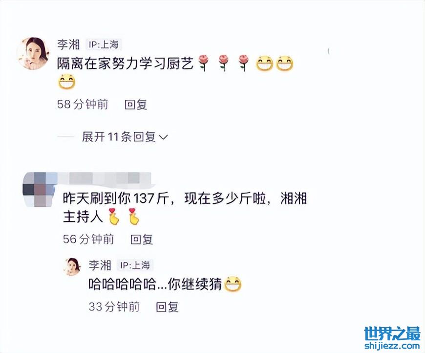 李湘在评论中表示隔离在家学习厨艺,有网友还问李湘体重多少斤,李湘俏皮回复“你继续猜”,语气平易近人十分友好。看得出来大家十分关注李湘的身材与体重。