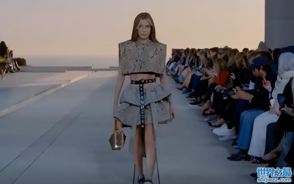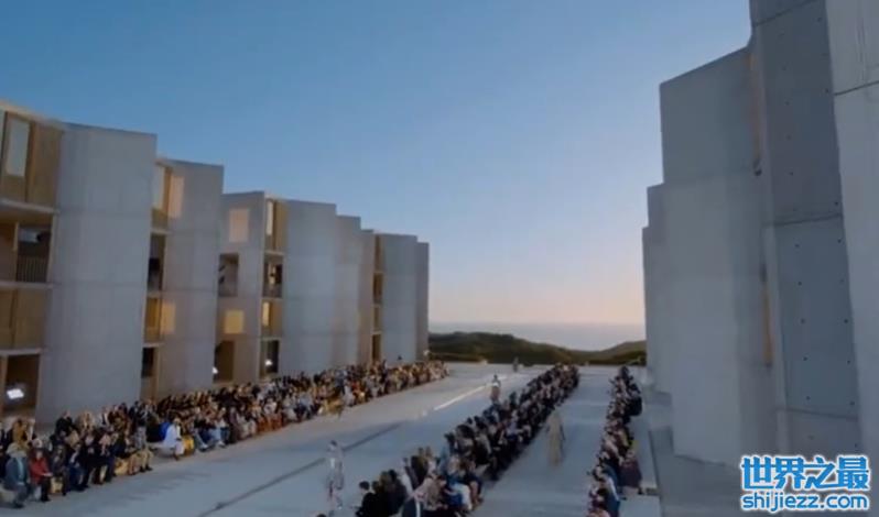 环顾秀场我们可以看到,在T台周围坐着许多观众,T台上的模特穿着各种各样的服饰都大放异彩。秀场环境高级优美,建筑物十分简约,而远处是一片海岸,低矮的山重重叠叠,隐约可见的海岸优雅美丽。