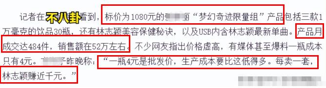 虚假宣传就算了,林志颖卖的这款产品售价1080元,批发价只要4元,而生产成本就更低了。每卖一套,他就能赚上千元,又能给他的豪宅添一块砖了。