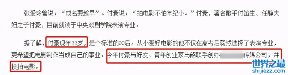 除此之外,付豪也颇有事业心。他小时候很喜欢电影,后来还学了相关的专业。在大学毕业之后,付豪还与好友一起创办了一家传媒公司,自己当起了总裁,可谓是年轻有为。现在才29岁的他,已经有了名气和成就,也是一个成功的“星二代”。