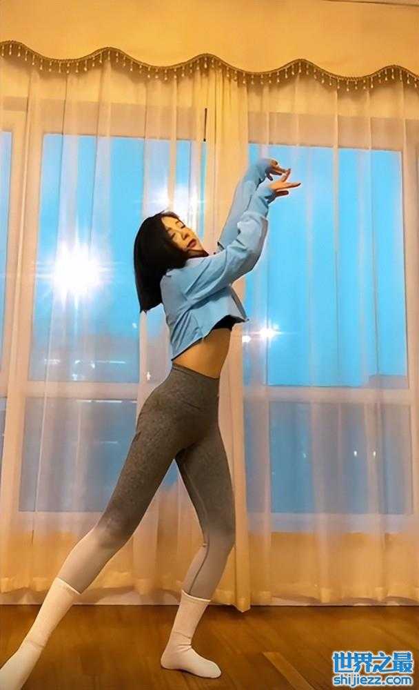 赵奕欢穿着一身健身服,紧身的裤子显得她的腿更加修长。赵奕欢抬起胳膊,身体柔软。她穿着短上衣露出大片肌肤,腰腹部没有一点赘肉,腰肢非常纤细。而值得注意的是赵奕欢穿着一双白袜子在地板上跳舞,丝毫不嫌脏,随意又率性。