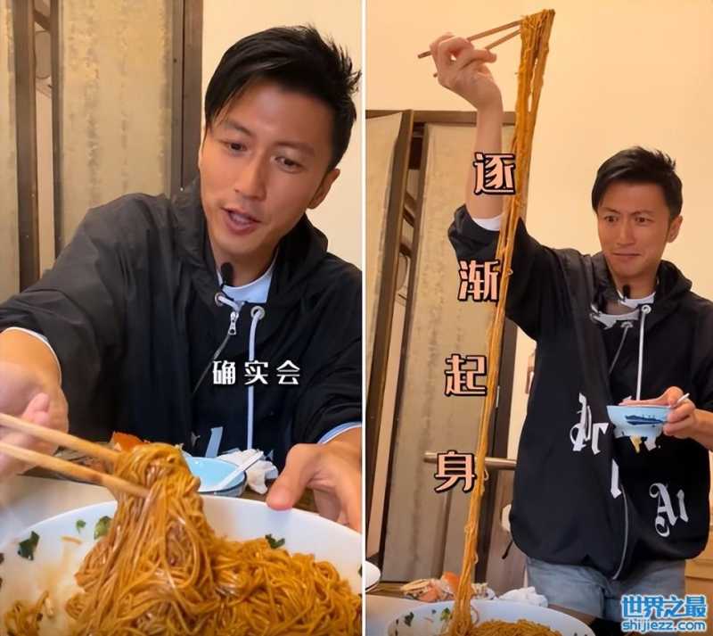 吃面的时候更是有趣,谢霆锋先是在碗里拌了几下,之后用筷子夹起一大把面准备往碗里装。但是没想到面太长,谢霆锋怎么拉长也没有到头,之后只得站起来,才把面全部拉出来装进碗里,画面十分滑稽。