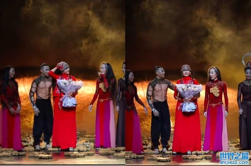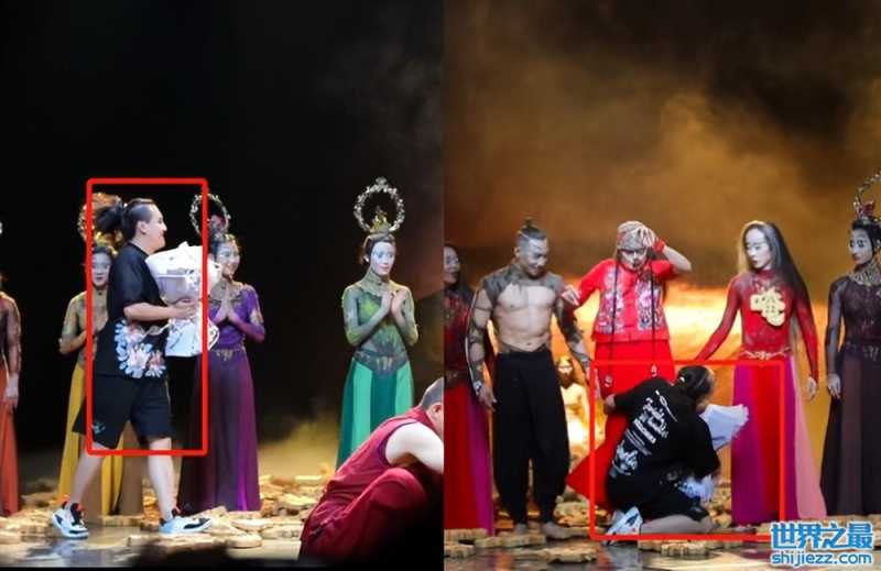在最后的展示结束之后,有个胖胖的粉丝抱着一束花,兴高采烈地走上了舞台,准备把这束花献给杨丽萍。不知道是不是见到杨丽萍太激动了,粉丝在快要见到杨丽萍的时候脚下一个踉跄,直接摔在了杨丽萍的脚下,杨丽萍也是吓得直往后躲。
