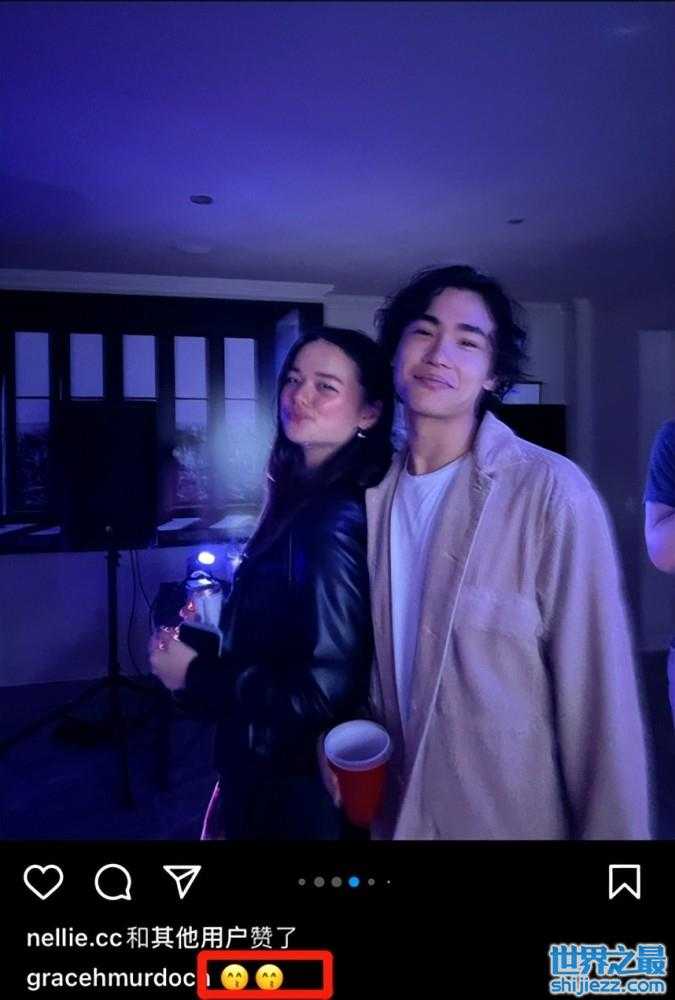 照片中,格雷丝身穿一件黑色皮衣,侧身站立在左边,而身边的男生则是瘦瘦高高,一头卷发,穿着一件白色T恤和卡其色外套,打扮得十分阳光帅气。只见在这个昏暗的房间里,灯光摇曳,格雷丝与这个男生紧靠在一起,笑得十分开心。