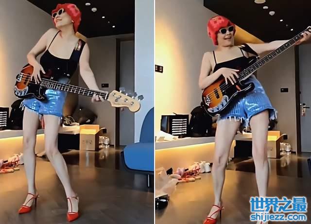 54岁张蔷穿超短裤炫长腿,低胸吊带秀事业线,抱电吉他嗨唱太投入 ...