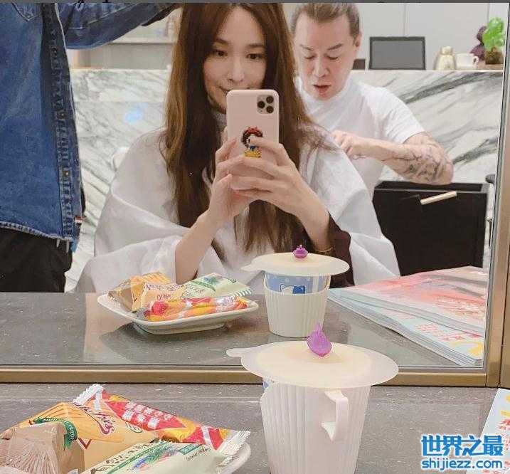 她在发型设计师的打理之下,开心地对着镜头拍摄,桌上还放着小甜点,心情自然是美美的。