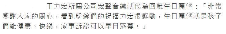 港媒形容王力宏失去了一切,在他46岁生日他也没有露面感谢粉丝们。而王力宏所属的音乐公司宏声音乐代替他发生生日愿望:非常感谢大家的关心,看到粉丝们的祝福王力宏很感动,生日愿望就是孩子们能健康快乐,家事诉讼能早日落幕。
