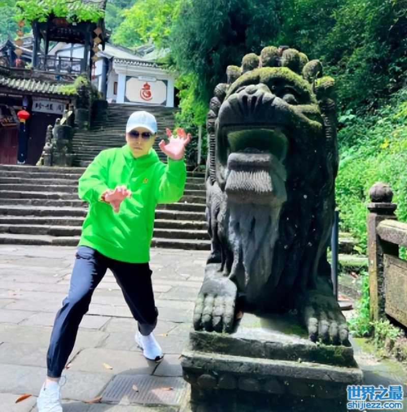 近日,甄子丹晒出与老婆汪诗诗在四川青城山游玩的照片,画面中甄子丹穿着绿色外套,在石狮子旁张牙舞爪,模仿着石狮子的形态。甄子丹表情严肃,看起来真有石狮子一样凶狠的模样。甄子丹身后的景色优美古朴。远处的小亭子古色古香,而甄子丹这身绿色的搭配与大自然融为一体。