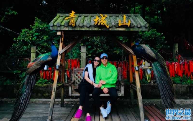 画面中,甄子丹与老婆坐在写有青城山的秋千上合照。汪诗诗靠在甄子丹肩膀上,脸上充满笑容,甄子丹紧紧握着老婆的手,两人恩爱十足。汪诗诗穿着简单的T恤与一双亮眼的运动鞋,胳膊上的赘肉非常明显。