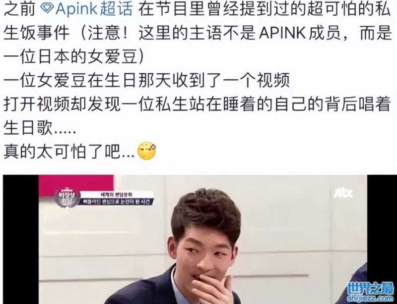 私生饭是指为了自己满足对明星的窥私欲,或是幻想自己与偶像有亲密关系而做出许多过激行为的疯狂粉丝。之前在韩国某个综艺上就有女爱豆透露说自己在生日那天收到了一个视频,但是视频的内容却是一位私生饭站在睡着的自己背后唱生日歌,这个画面简直不寒而栗。
