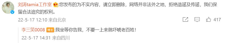 眼看着外界的矛头都纷纷对准刘涛,大家也都参与到热议中,刘涛工作室也火速发声回应,在“李三笑”博主的爆料贴下面回复称“您发布的为不实内容,请立即删除,网络并非法外之地,拒绝造谣及传谣,我们保留合法追究的权利。”