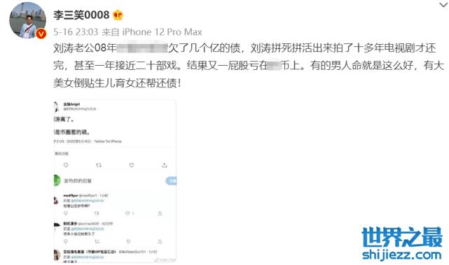 其中一位知名博主“李三笑”更留言称刘涛老公王珂08年就欠了几个亿的债,刘涛拍了十多年电视剧才还完,甚至一年接二十部戏,结果王珂又巨亏了,还调侃称有的男人命就这么好,有大美女生儿育女还帮还债。