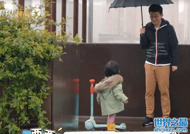 下午,到了西西的户外活动时间,张效诚带着女儿在雨中玩滑板车,一直弯腰给孩子撑伞。