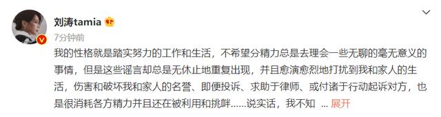 刘涛发文称自己是一个踏实努力工作的人,不希望分出精力去理会这些无聊的事。而且自己的爱人这么多年都在默默支持自己的工作。刘涛还说想不通发布这些不实信息的人到底有何所求,所以希望大家也不要再转发那些纯属捏造的谣言了。