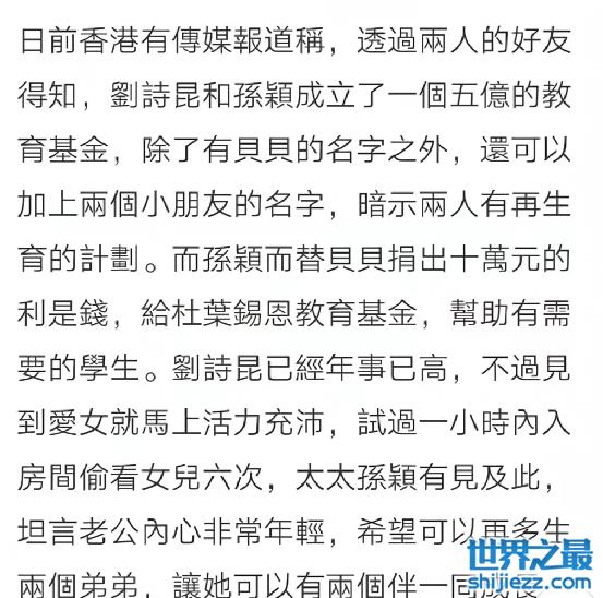 其实刘诗昆和前妻也有两个儿子,最大的也已经60多岁,可这却是刘诗昆唯一的女儿,所以宠爱起来也是十分大手笔。孙颖曾透露,刘诗昆几乎一刻都离不开女儿,即使客人来到家里,刘诗昆总忍不住跑到房间去看女儿,把客人晾在一旁。