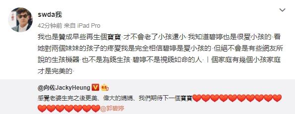 相信二胎宝宝的到来也会让郭碧婷与向佐的人生更加圆满与充实,衷心祝愿郭碧婷能平安生产,一切顺利,早日传来喜讯。