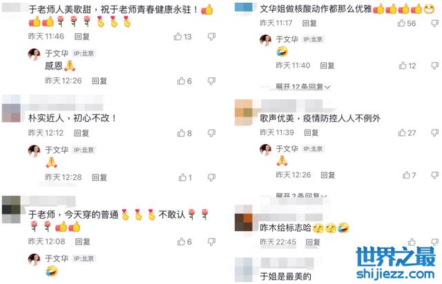 这样一条视频发出来之后也引来了许多网友评论,大家都在夸于文华人美歌甜,还祝于文华能够青春健康永驻。也有人说于文华今天穿得十分低调朴素,都不敢认了,但这样朴实近人初心不改的精神却更值得大家的喜爱了。
