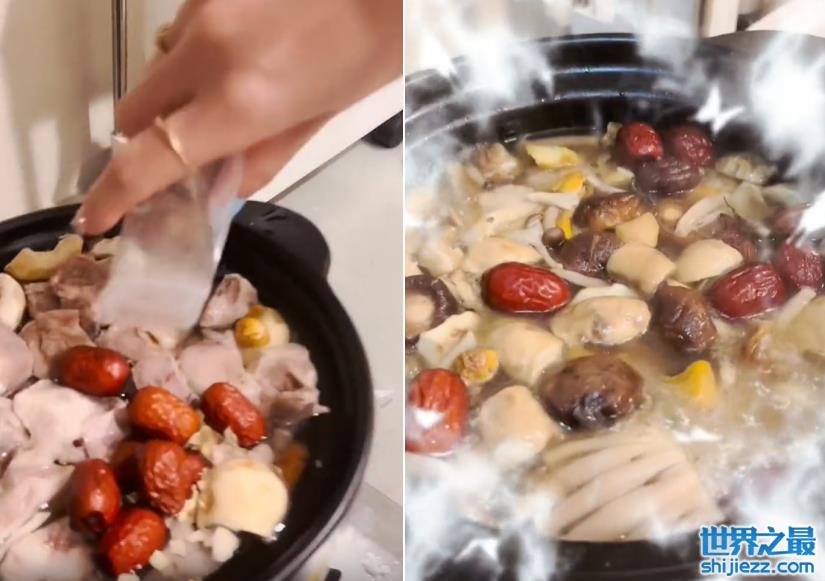 葛荟婕准备的食材塞满了一整锅,大有溢出来的趋势。只见锅中有着红枣、菌菇、西洋参等等材料,十分丰富。做好之后,整锅汤显得非常诱人,想必味道也很好。